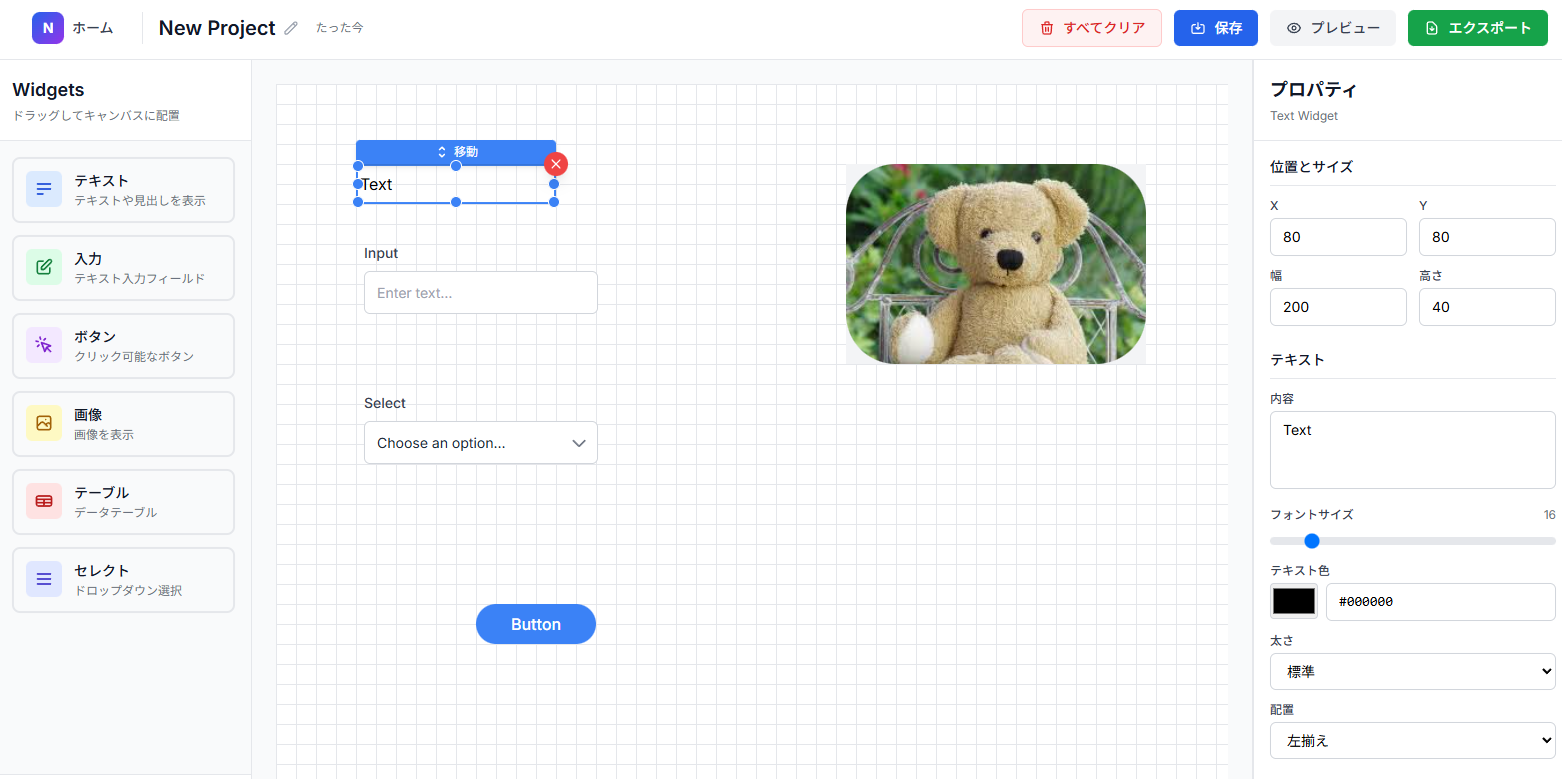 プロパティパネルで色、サイズ、テキストを編集。 変更は即座にキャンバスに反映されます。